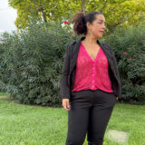 Vêtement adulte Une combinaison Marieke bronze… ou caca d’oie ? 6 octobre 2025 Pour ma deuxième réalisation, j’ai opté pour une combinaison Marieke bronze. Certain.es, dont moi, appellent cette couleur caca d’oie. Et bien je l’aime quand même ! Coudre la combinaison Marieke bronze J’ai acheté ce crêpe pour sa couleur que j’aime beaucoup ! Je voulais en faire un pantalon et j’ai réalisé une fois commandé que la laize était étroite… j’ai dû recommander un deuxième coupon ! Et du coup j’en avais assez pour une combinaison ! Le tissu bronze ou caca d’oie C’est un crêpe de viscose de chez Bennytex pas très agréable au toucher. À vrai dire, il froisse aussi mais sa couleur est très lumineuse même si elle ne plaît pas à tout le monde.Je l’ai trouvé assez facile à coudre, il reste bien en place. La couture de Marieke J’avais trouvé la couture de la première combinaison d’une facilité et d’une rapidité déconcertante et… c’était le cas cette fois aussi. Tout est clair, il n’y a pas de difficulté et en quelques heures la combinaison voit le jour ! J’ai coupé la taille 40 en me fiant à ma première version qui me va parfaitement. Comme pour celle-ci, j’ai posé des pressions Kam bronzes que j’avais en stock et je dois dire que tout s’accorde à merveille ! Place à la bidouille Au moment de rejoindre le haut et le bas par la ceinture, je me suis retrouvée avec un écart assez important. Je ne sais pas pourquoi ! Il arrive que les ceintures bougent au peu au repassage mais ça se joue à un ou deux centimètres pas à 6 ! Évidemment, j’ai dû trafiquer pour faire coïncider le haut et le bas… J’ai finalement opté pour la pire des solutions, à savoir, les plis. Pourquoi je n’ai pas froncé alors qu’il faut ensuite passer un élastique à la ceinture qui fronce le tout ? Aucune idée. Porter la combinaison bronze Je suis un peu déçue. Je trouve qu’elle tombe moins bien que la première version. Peut-être aussi la faute à la bidouille que j’ai dû réaliser ? Sûrement… Dans un monde idéal, il faudrait que je démonte la combi pour faire quelque chose de propre à la ceinture. Il faudrait que je repose 3 pressions qui sont un peu récalcitrantes aussi… Est ce que je la porte quand même ? Évidemment ! J’ai fait une association que j’adore avec du bleu cobalt sur les chaussures, les boucles d’oreilles et le sac à main en soie, rapporté de Chine ! BennytexCombinaisonCoutureGarde-robeIkatee Previous post Le top Imarre en dentelle, tricot d’été très rose ! Ma première robe MonetaBlouse Tilda d’hiverLe survêtement kaki : jogging Jojo et sweat Capitole Leave a reply Annuler la réponse Δ Ce site utilise Akismet pour réduire les indésirables. En savoir plus sur la façon dont les données de vos commentaires sont traitées.