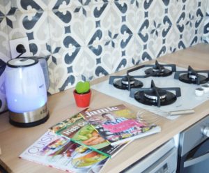 Ma déco Relooking WC : inspiration Lisboa 1 mars 2017 Sais-tu que mon article sur la déco de mes toilettes est l’un des plus lus du blog ? Déjà que j’étais décomplexée du WC (!), cet engouement renforce encore mon adoration pour cette petite pièce. Oui, je le dis, je le redis, je l’écris et le grave dans le marbre impalpable de l’Internet : j’adore cet endroit ! Je te vois, toi là-bas avec ta mine dubitative et ton air légèrement outré, mais dis-moi, où peux-tu être enfin seule *, lire tranquillement ou consulter les stories Instagram en paix ? Si tu me réponds dans ma chambre / mon salon/ mon boudoir, tu as bien de la chance et, ou, tu n’as pas d’enfant/ de mari/ de chat collants.*Solitude toute relative avec un enfant en bas âge qui souhaite à tout prix analyser le pourquoi du comment de ta personne, surtout lorsque tu vas aux toilettes… Alors, on repart pour un tour et je t’invite à pénétrer dans l’unique et exiguë pièce de mon chez moi entièrement terminée et décorée ! Dans notre – plus si nouveau mais toujours en travaux – appartement adoré, les toilettes sont du genre microscopiques, aveugles et franchement tarabiscotées. En arrivant, on s’est contentés de poser un linoleum assorti au parquet de la maison et de fixer au mur un porte papier-toilette. Niveau déco tu repasseras. Côté accueillant de la pièce : zéro pointé. Début de la transformation Tout aurait pu rester en l’état sans l’aide de notre voisine. Elle a eu l’amabilité d’inonder notre mur mitoyen et de faire ressembler mes WC à l’état de mes cuisses après ma grossesse (comprendre : gondolé et ramolli). Avec le dédommagement de l’assurance nous avons décidé de refaire les murs, de faire coffrer proprement la conduite qui était jusqu’alors un trou béant, de décoffrer les tuyaux (mais quelle idée ?) mais aussi de changer carrément les WC. Nous avons opté pour des toilettes avec micro lavabo intégré qui permet de faire des économies d’eau puisque l’eau utilisée pour se laver les mains vient ensuite remplir la chasse. Ça permet aussi de progresser en hygiène et de ne pas toucher quinze portes, poignées, boutons avant de se laver les mains ! Oui, je suis un peu sensible de la propreté des mains… De bonnes bases pour la déco Nous avions alors des toilettes neuves aux murs blancs et propres. Une toile blanche parfaite pour commencer à penser la déco. J’ai fureté sur Pinterest, j’ai fait des plans et des dessins… bref, j’ai fait comme d’habitude et ça m’a pris un temps fou ! Pendant ce temps, les multiples lavages de mains au mini lavabo ont commencé à faire de petites projections crado sur mon mur blanc et j’ai dû intégrer cette donnée dans ma déco. J’avais décidé de poser un carrelage sur le mur du fond mais : la zone pas du tout facile d’accès derrière les toilettes déjà posées, le mur pas plane du tout et les différents angles à gérer, la nécessité de m’équiper totalement en matos de carrelage, m’ont un peu refroidie. J’ai dû ruser pour arriver à mes fins sans passer par la galère du carrelage. Ordonnance déco Pour mes toilettes idéales, je voulais : Une déco qui pète : dans les petites pièces pleines de défauts autant y aller à fond. Il n’y a littéralement pas de place pour la demi-mesure. Une couleur dominante, marquante elle aussi. Des rangements, ou du moins la possibilité de poser des (jolies) choses Du pratique : savon et serviette pour les mains, papier toilette de secours pour éviter le « cherrriiiii, y a plus de papiiiiiieeeeerrr ». Une protection anti-projections sur le mur du fond La possibilité de stocker mes magazines, puisque c’est aussi mon « cabinet de lecture ». Do It mYself Tout est parti de ce papier peint, trouvé au grès de balades en ligne. J’ai adoré l’imitation carreaux de ciment bordéliques, sa couleur bleue. En vinyle, il est adapté aux salles d’eau et convenait parfaitement. J’ai donc acheté un rouleau et construit toute ma déco autour de ce papier. J’ai récupéré au bureau un porte document mural et je l’ai repeint en blanc mat pour qu’il se fonde dans le mur. Papa m’avait donné un porte-serviette en métal, que j’ai aussi bombé en blanc. Ça c’était la partie facile. Je me suis ensuite attaquée à la pose de papier-peint. Les raccords n’ont pas été évidents avec le motif compliqué et les différentes découpes à faire mais je m’en suis sortie. La pose dans une pièce si petite n’est vraiment pas facile : j’ai tremblé à cloche-pied sur mes toilettes et dû ruser plein de fois pour accéder au mur, mais j’ai réussi ! La déco du sud, 95% récup Pour finaliser ma déco sur ce thème lusitano-méditerrannéen j’ai surtout rassemblé beaucoup d’objets que j’avais, dont certains décoraient déjà ma chambre d’adolescente. Oui, le bleu et moi c’est une longue histoire. J’ai choisi de jouer l’accumulation en installant tout sur une planche en bois brut, au-dessus des WC, pour donner un petit côté cabinet de curiosités et y aller à fond. Mes seuls achats ont été : une petite étagère gris clair pour y placer le porte-savon, deux serviettes à mains bleues et une balayette. Les deux miroirs ont été ramenés du Maroc, choisis par Maman, à ma demande, pour parfaire ma déco. Sur le mur de gauche, mes journaux sont disposés façon présentoir. C’est parfait pour s’y retrouver et j’aime bien le côté « boutique » que ça évoque. Le résultat J’adore ces toilettes ! C’est pratique, c’est joli. Le papier-peint résiste très bien à l’usage… Le seul défaut ? A chaque fois que je sors des chiottes, je passe dix bonnes minutes à fredonner une chanson d’Amalia Rodrigues : « Numa casa portuguesa fica bem / Pão e vinho sobe mesa… ». Ce doit être l’effet Azulejos… Liste des courses Papier peint lisboa 4 murs : 14,90€ Colle à papier-peint