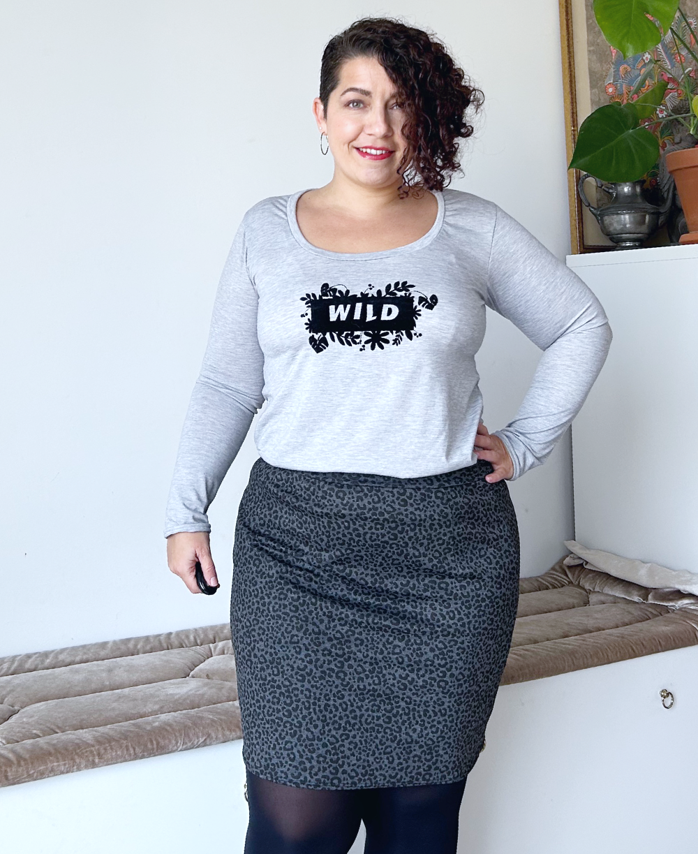 Vêtement adulte Une nouvelle tenue sauvage tout en jersey 9 mars 2023 Quand j’ai envie de coudre des pièces rapidement et de remonter mon niveau de satisfaction j’opte pour le tout en jersey. C’est ce que j’ai fait avec cette nouvelle tenue très sauvage…. Coudre tout en jersey Si la couture du jersey fait peur aux couturières débutantes, c’est pourtant une matière très agréable à travailler. Elle permet de réaliser des pièces aussi satisfaisantes à coudre qu’à porter. Oui ! on veut du confort et si on passe pas à chaque fois 15h à coudre un vêtement, c’est pas mal. Les patrons de ma tenue tout en jersey J’ai opté pour ma jupe “Elle frost”, j’avais téléchargé le patron sur un blog il y a fort longtemps. Il y a deux pièces devant et dos identiques avec des pinces. Je rajoute une ceinture et j’arrange la longueur en fonction de mon envie. Le t-shirt fait partie de mes basiques, c’est le Plantain de Deer and Doe. C’est mon préféré, parce qu’il est très facile à coudre et sa large encolure dégagée en fait l’allié de mes pulls tricotés. Quels tissus “jersey” ? La jupe à imprimé léopard anthracite et gris est un punta di Milano de chez Driessenstoffen. C’est une maille assez dense et finalement peu élastique. Le jersey du t-shirt vient du Tissus de Ursules, ma sœur me l’a offert il y a plus de 10 et il dormait dans mon stock… Je t’ai dis que j’ai choisi de ne pas acheter de tissu cette année et d’utiliser uniquement les kilomètres que j’ai déjà ? Voila. La couture de ma tenue sauvage Globalement, ces pièces se cousent très vite, un peu à la machine pour les pinces, les ourlets, etc et beaucoup à la surjeteuse. Depuis que je me suis offert une Babylock, c’est encore plus simple ! J’ai coupé la ceinture un peu trop petite, ou alors j’ai grossi, ou les deux. La jupe léopard reste tout de même confortable mais faudra pas déraper à Pâques ! Pour le t-shirt, j’ai une encolure magnifique et c’est assez rare pour en parler. Certes, j’ai un micro pli l’arrière mais l’avant est tellement joli, qu j’ai laissé comme ça. Et voilà, une nouvelle tenue dans ma garde-robe ! Customisation du t-shirt avec Cricut (et Elise) Et ce flock sur le t-shirt, on en parle ? J’avais vraiment envie de m’améliorer avec ma Cricut Joy. les premiers essais de flex ont été lamentables (lis les instructions Elise, conseil d’amie). Alors cette fois, j’ai tapé fort : j’ai d’abord,commandé du flock, un thermocollant touché velours, sur Rascol. J’ai pris le temps de regarder des tutos et de comprendre comment bine découper et comment bien poser ces thermocollants. Ensuite, dans un grand élan créatif, j’ai entrepris de créer mon propre motif, puisque j’avais une idée très précise de ce que je voulais. Fin du suspens : j’ai réussi à fixer mon motif “Wild” sur mon t-shirt en jersey et je l’adore ! Porter une tenue en jersey La jupe est courte mais c’est très facile à porter avec des collants opaques. La tenue complète est confortable et j’aime beaucoup le style. Je la porte avec mon gilet Watson qui est dans le même ton que le t-shirt et des baskets. Je suis ravie de ces pièces et d’avoir enfin passé le cap du thermocollant ! Évidemment les filles me réclament leurs t-shirts customisés… va y avoir de la paillettes ! BabyLock EnspireCoutureCricut JoyCustomisationDeerandDoeDriessenstoffenJerseyJupeT-shirt Previous post Le gilet Curio en laine Studio Donegal Next post Un châle pour homme : tricot rapide ! Une combinaison Sirocco Mint sauvée de justesse !Pantalon de grossesse DIYLa jupe Betty mint Leave a reply Annuler la réponse Δ Ce site utilise Akismet pour réduire les indésirables. En savoir plus sur la façon dont les données de vos commentaires sont traitées.