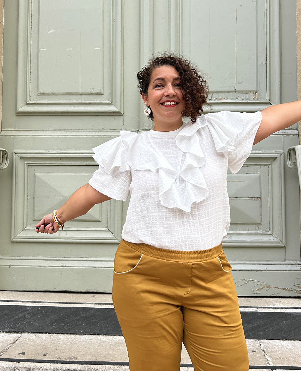 Vêtement adulte Le top Marguerite pour mon coupon Marseillais 24 juin 2023 Dans mon interminable liste d’envies, le top Marguerite était en bonne place. Le défi du coupon Marseillais l’a aidé à remonter tout en haut ! Coudre un top Marguerite J’avais craqué sur une version rayée de ce top. Par chance, j’ai trouvé le livre dont il est issu à la bibliothèque. Je l’ai décalqué, j’ai pris les instructions en photos et j’ai sagement rendu le livre. Deux ans après, il n’était toujours pas cousu jusqu’à ce que les copines Marseillaises m’invitent à participer au défi Mon coupon Marseillais. #Moncouponmarseillais c’est quoi ? Le principe est simple : on achète toute le même tissu au marché de la Plaine, celui que toute la France nous envie. Puis, chacune réalise un projet cousu avec ce tissu. Pour cette deuxième édition, le coupon choisi était une sorte de gaze blanche avec une texture de petits carreaux. Léger, aérien et très transparent ! Sagesse ou folie, avec Marguerite, j’ai choisi ! J’hésitais à me coudre un chemisier avec ce coupon. C’était l’option raisonnable, puisque j’en manque dans ma garde-robe, surtout des blancs. En optant pour le top Marguerite, j’ai choisi de faire une pièce forte, pas facile à porter et qui me ravit ! Le patron du top Si ma version est un peu plus longue, le patron original du top Marguerite est bien crop. C’est un top avec un jeu d’empiècements en V et de volants assez volumineux. J’ai choisi de faire la totale en mettant, tous les volants, même celui des manches qui est le plus voyant. Je pense que ma version est du 44 (à l’époque il ne m’avait pas semblé utile de le noter sur les pièces décalquées…). Le livre s’appelle “Ma garde robe bohème chic » et est signé Charlène Plaut. Il y avait de jolies pièces proposées mais je n’ai retenues que celles-ci, je pourrais peut-être l’emprunter à nouveau pour voir si je suis passée à côté d’autres patrons ? Coudre le top Dans la série “merci Elise du passé”, j’avais photographié vite fait les instructions du patron sans rentrer dans le détail. J’ai réalisé pendant la couture que le livre renvoyait à des parties techniques sur d’autres pages que je n’avais pas… La couture s’est quand même déroulée sans souci, parce que le montage, bien qu’assez peu conventionnel, est très logique. Ce patron m’a permis de réaliser le premier ourlet roulotté de toute ma vie. Il est correct, le prochain sera parfait. Et les volants tombent vraiment bien mieux que sur mon Top madame… La tenue qui en jette Pour aller avec ce top Marguerite, j’ai réalisé un pantalon Dressed, qui lui, était bien au programme couture de ce trimestre ! Je l’ai coupé dans un satin de coton couleur ocre que j’adore. C’est le même tissu que mon pantalon Port, toujours de chez Driessenstoffen. J’ai rajouté un passepoil doré aux poches et des poches arrières, piquées sur le pantalon Port, avec un rappel du passepoil. J’adore l’ensemble, avec mes talons, je trouve que ça fait une tenue sympa ! Évidemment je n’ai encore rien porté puisque je passe mon temps à la maison et qu’il fait une chaleur démentielle. On sait aussi que ces talons, sont bons pour les photos mais que ce sont les sandales plates qui iront avec dans la vraie vie. Le Top Marguerite, c’est Marseille bébé ! C’est aujourd’hui que nous dévoilons sur Instagram toutes nos projets cousus dans le tissu du défi. J’ai hâte de voir ce que les autres ont fait. Je pense qu’il y a des merveilles… Si tu en doutais, sache qu’il y a du niveau en couture à Marseille ! Ce top Marguerite m’a redonné l’envie de coudre des tenues plus fortes. Les basiques, c’est bien pour calmer le jeu, mais un top Marguerite, c’est autre chose niveau prestance ! BabyLock EnspireCoutureDeerandDoeGarde-robeLivre DressedMon coupon MarseillaisPantalonPfaff Ambition 1.5Top Marguerite Previous post Le déguisement de Cléopâtre pour le carnaval Next post Des gilets de berger en fourrure pour petites filles Jupe en double gaze – Inspiration « des petits hauts »Le gilet sunset en patchworkVite une robe Lora moutarde ! Comments Trackbacks & Pingbacks La combi Marieke : le coup de coeur ! - Elise lovecraft dit : 8 juin 2024 à 11:09 […] avons réitéré le défi Mon coupon Marseillais, donc aujourd’hui, sur Instagram, tu vas voir fleurir des tas de variantes avec le même […] Répondre Pantalon Essential : la toile très portable ! - Elise lovecraft dit : 30 mai 2024 à 10:15 […] alors c’est moi qui suis une petite marrante. C’est le tissu que mes copines ont choisi pour le défi mon coupon marseillais de cet hiver. J’avais alors passé mon tour, pas inspirée par sa couleur kaki. Au moment de choisir une […] Répondre Leave a reply Annuler la réponse Δ Ce site utilise Akismet pour réduire les indésirables. En savoir plus sur la façon dont les données de vos commentaires sont traitées.