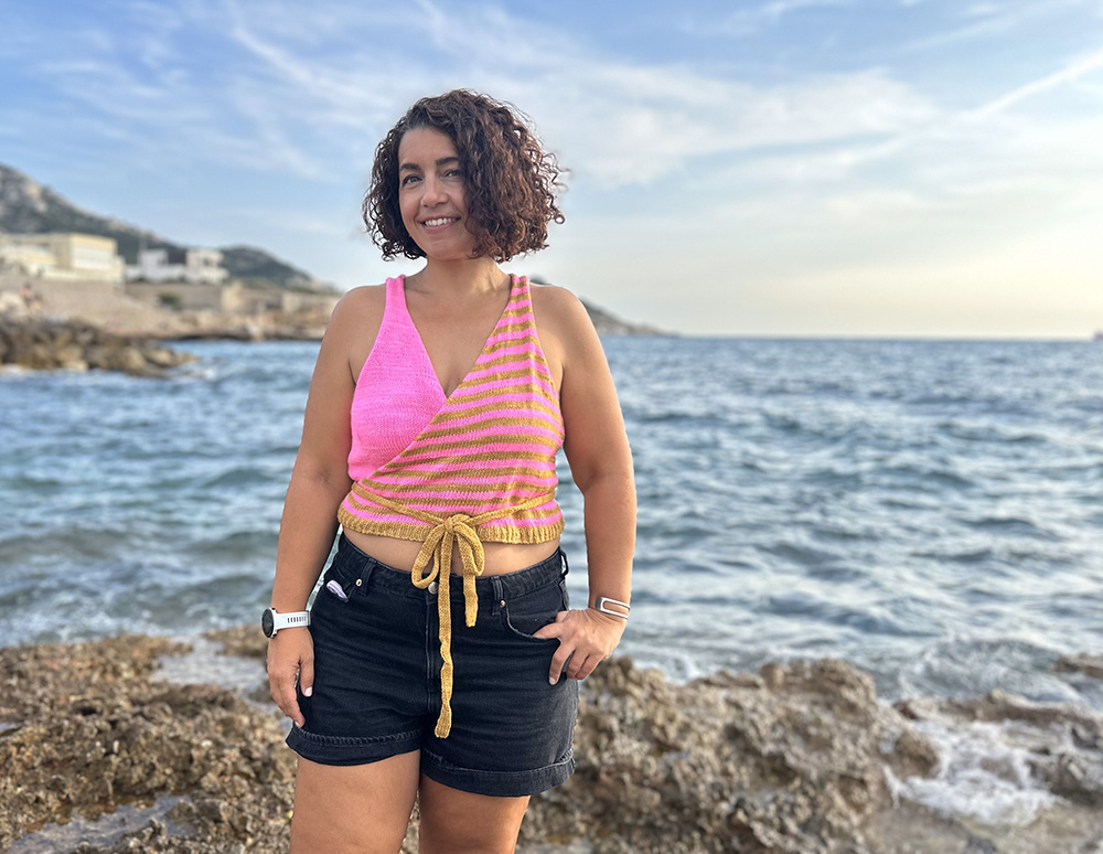Pull et gilet adulte Un Venice Wrap Tank : tricot d’été ! 18 juillet 2024 Le Venice Wrap Tank, je l’ai découvert, porté par la créatrice d’une laine que j’adore. C’est bien simple : j’ai tout copié pour faire le mien ! Tricoter le Venice Wrap Tank Quand j’en ai vu Lili avec son top tricoté en moutarde et rose, j’ai tout de suite acheté de quoi réaliser le même. J’ai découvert un patron très sympa et une nouvelle laine par la même occasion ! Le patron du Venice Wrap Tank C’est donc un crop top croisé qui se ferme par deux liens sur le devant. Le dos a une emmanchure américaine que j’adore. Son petit défaut, c’est qu’il se tricote en morceaux qu’il faut ensuite coudre ensemble. Comme c’est un petit projet, ça n’a pas été trop fastidieux. La laine Solstice de l’écheveau solidaire C’est Lili qui m’a permis de réaliser ce top en me faisant découvrir le patron et en me vendant la laine. Elle m’a conseillée d’opter pour la Solstice : une fingering 100% mérinos non traitée. Finalement, j’ai été agréablement surprise par le rendu, le gonflant et la douceur du fil, une fois tricoté. J’ai choisi le rose très vif et le très joli moutarde, exactement comme sur la version de Lili, donc. Il n’y avait plus qu’à le tricoter ! Tricot rapide L’avantage de monter chaque devant séparément, c’est que ça monte vite ! J’ai adorer réaliser le pan rayé, ces couleurs ensemble me remplissent de joie. Elles saturent un peu sur mes photos bord de mer de fin de journée mais je t’assure que c’est magnifique. Le tricot du dos a été un peu plus fastidieux, mais pas à cause du patron. Plutôt à cause d’un manque de temps terrible au mois de juin… C’est à cause de ce planning chargé que j’ai finalement mis tant de temps à tricoter un si petit top ! Le premier lien m’a pris presque 10 jours à raison d’un ou deux rangs par ci par là. L’art de l’échantillon Tu le sais peut-être, je suis une très mauvaise élève de l’échantillon. Je fais quelques rangs, je mesure, j’adapte la taille des aiguilles et c’est parti ! Ne reproduis pas ça chez toi ! En plus, je ne teste jamais la réaction du fil au lavage / blocage. En plus, je tricoté très lâche, et tout mis bout à bout, mes pièces tricotées sont souvent trop grande. Est-ce que je vais améliorer ce point ? Non je ne pense pas… Le Venice Wrap Tank : un joli top d’été ! J’imaginais porter le top par-dessus un maillot pour une soirée à la plage et c’est ce que j’ai fait ! Son décolleté croise le rend très sexy, du coup, sans rien en dessous, il ne sera pas adapté à une journée de boulot. Je n’ai pas encore testé de le porter autrement, on verra à la rentrée sur un t-shirt peut-être, comme mon tricot sans manche adoré. Tu l’a compris, il s’est révélé un peu grand une fois bloqué. Ça n’est pas très gênant sur le devant, le système de lien me permet d’ajuster la taille.Par contre les emmanchures sont un peu larges et dévoilent trop de peau… Tant pis, il va peut-être se rétracter un peu avec le temps ? Porter le top Il est très confortable, même contre la peau et ne tient pas trop chaud. Ces couleurs sont dingues et je trouve qu’elles me donnent une super mine.Tu portes des tricots d’été toi ? étéroseTopTricot Previous post La robe Lea en fluo ! Next post La robe Emilie : un peu mexicaine Le pull Katharine en Big Bad yarnLe top Imarre en dentelle, tricot d’été très rose !Wanderlust Tank : tricot d’été urgent ! Leave a reply Annuler la réponse Δ Ce site utilise Akismet pour réduire les indésirables. En savoir plus sur la façon dont les données de vos commentaires sont traitées.